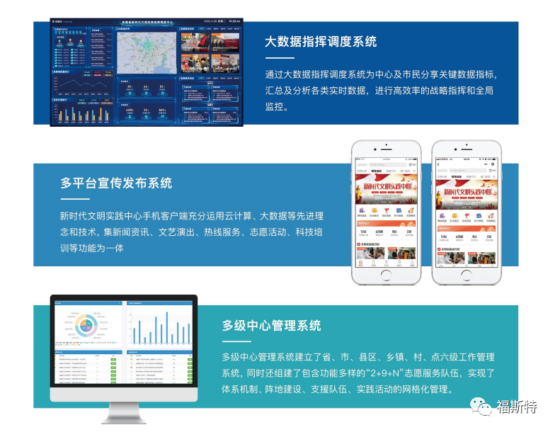 福斯特新時代文明實踐中心云平臺集服務、管理、發(fā)布、展示于一體,推動平臺、終端、和渠道互聯互通,為基層黨的理論宣講、文化建設和為民服務提質增效,為志愿者、受益者與管理者提供了一個安全、快捷、便利、智慧化的新時代文明實踐管理工具